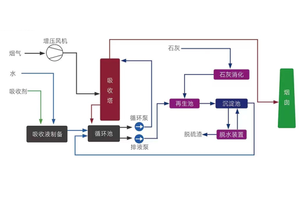 煙氣經(jīng)增壓風機進入吸收塔,與來自循環(huán)泵送入的吸收液接觸并被除去SO2。被洗滌后的煙氣經(jīng)塔內(nèi)除霧器除霧后進入煙肉外排,出吸收塔的吸收液返回循環(huán)池循環(huán)使用。當循環(huán)池內(nèi)吸收液的PH值降低至設定值時,排液泵自動啟動。將需再牛的吸收液泵入再生池進行再生(使用石灰漿液再生),然后進入沉淀池進行沉淀,沉淀池的上清液返回循環(huán)池。沉淀池的沉渣( 硫酸鈣及亞硫酸鈣)進入脫水裝置,脫水裝置形成的(濕)固態(tài)物即為脫硫渣,定期外排脫水裝置脫出的水返回沉淀池。運行過程中,應定期向循環(huán)池中加入新鮮的吸收液,以補充吸收液中所含的鈉堿量。